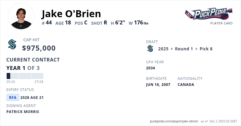 Jake O'Brien is signed to a 3 year, $2,925,000 contract with a cap hit of $975,000 per season, playing for the Seattle Kraken. His contract expires at the end of the 2027-28 season, making O'Brien a Restricted Free Agent.