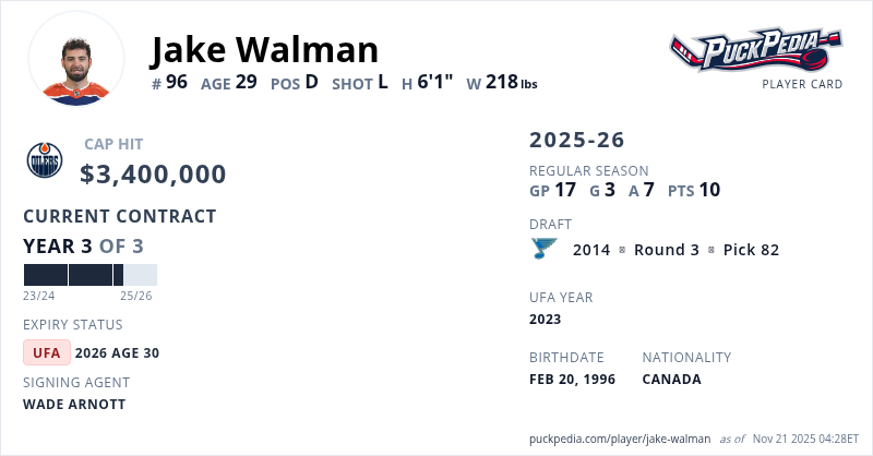 Jake Walman is signed to a 7 year, $49,000,000 contract extension with a cap hit of $7,000,000 per season. He plays for the Edmonton Oilers. His next contract begins for the 2026-27 season and expires at the end of the 2032-33 season, making him an Unrestricted Free Agent.