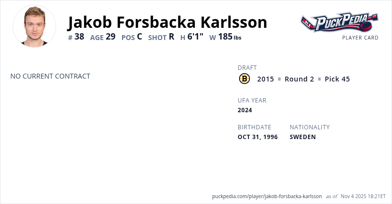 Jakob Forsbacka Karlsson is an Unrestricted Free Agent. His last contract was 3 years, $2,750,001 with a cap hit of $916,667 per season. It expired at the end of the 2018-19 season.