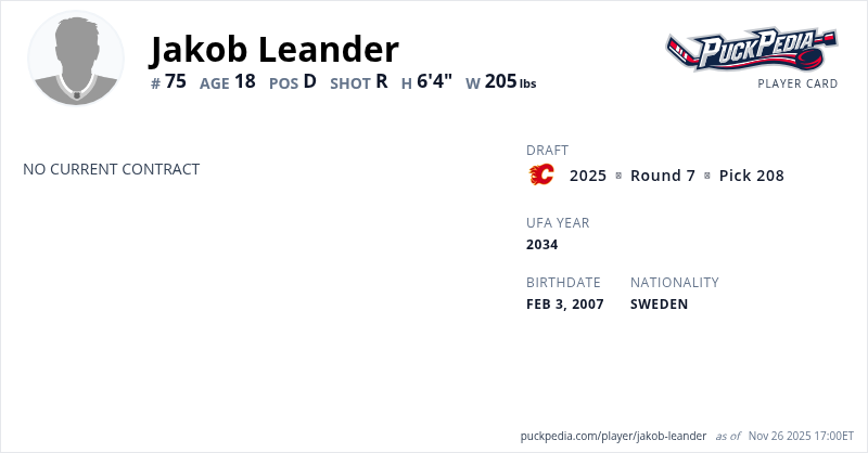 | 2024-25 | 17 | U20 Nationell | HV71 U20 | 39 | 1 | 5 | 6 | 49 | Playoffs | 2 | 0 | 0 | 0 | 0 | ||||||||||||||||