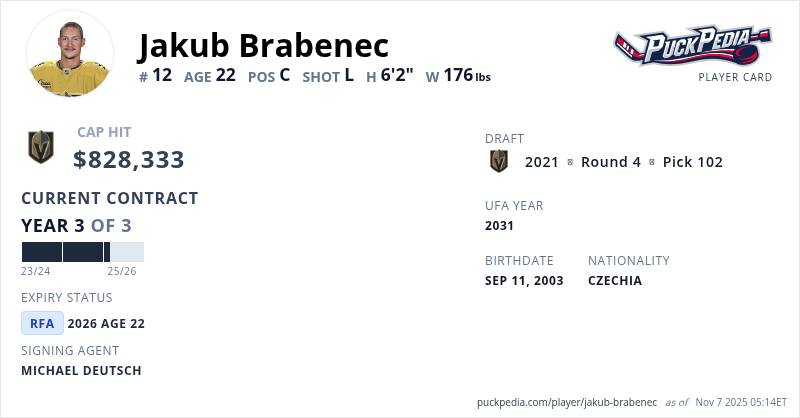 Jakub Brabenec is signed to a 3 year, $2,484,999 contract with a cap hit of $828,333 per season, playing for the Vegas Golden Knights. His contract expires at the end of the 2025-26 season, making Brabenec a Restricted Free Agent.
