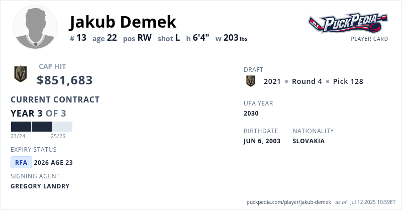 Jakub Demek is signed to a 3 year, $2,555,049 contract with a cap hit of $851,683 per season, playing for the Vegas Golden Knights. His contract expires at the end of the 2025-26 season, making Demek a Restricted Free Agent.