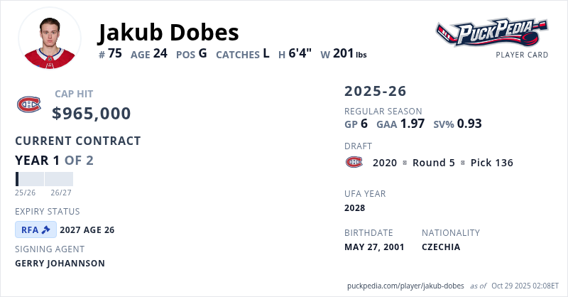 Jakub Dobes is signed to a 2 year, $1,930,000 contract with a cap hit of $965,000 per season, playing for the Montreal Canadiens. His contract expires at the end of the 2026-27 season, making Dobes a Restricted Free Agent.