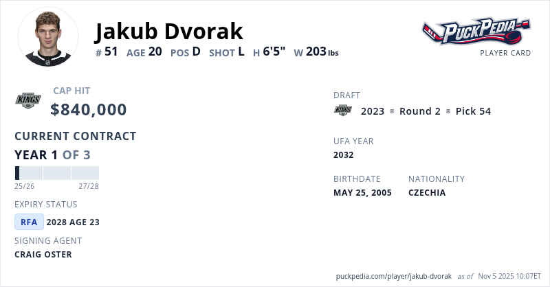 Jakub Dvorak is signed to a 3 year, $2,520,000 contract with a cap hit of $840,000 per season, playing for the Los Angeles Kings. His contract expires at the end of the 2027-28 season, making Dvorak a Restricted Free Agent.