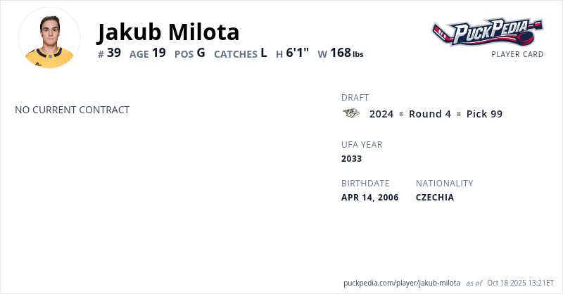 | 2025-26 | 19 | International-Jr | Czechia U20 (all) | 4 | 2.99 | 0.884 | 0 | |||||||||||||||||||||||