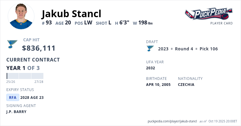 Jakub Stancl is signed to a 3 year, $2,508,333 contract with a cap hit of $836,111 per season, playing for the St. Louis Blues. His contract expires at the end of the 2027-28 season, making Stancl a Restricted Free Agent.