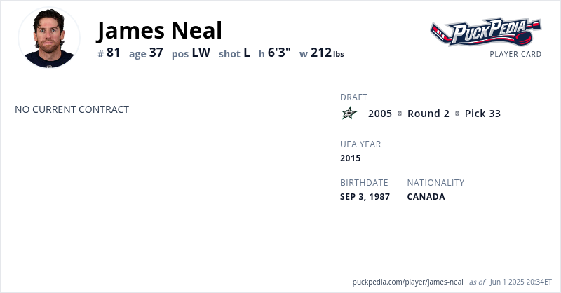 James Neal is an Unrestricted Free Agent. His last contract was 1 year, $750,000 with a cap hit of $750,000 per season. It expired at the end of the 2021-22 season.