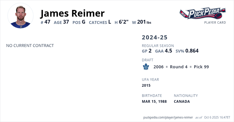 James Reimer is an Unrestricted Free Agent. His last contract was 1 year, $1,000,000 with a cap hit of $1,000,000 per season. It expired at the end of the 2024-25 season.