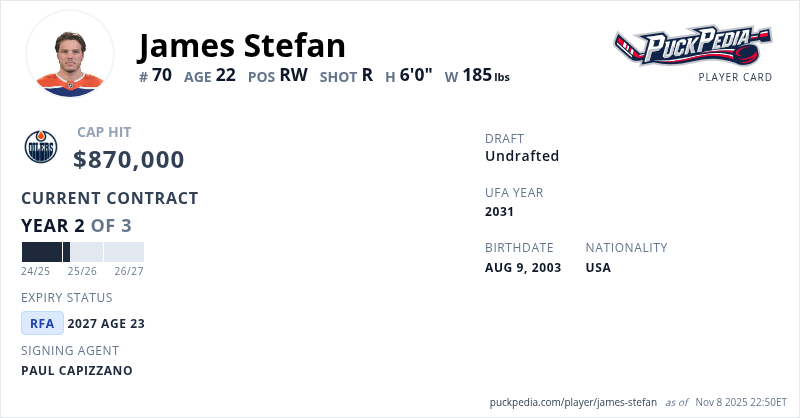 James Stefan is signed to a 3 year, $2,610,000 contract with a cap hit of $870,000 per season, playing for the Edmonton Oilers. His contract expires at the end of the 2026-27 season, making Stefan a Restricted Free Agent.