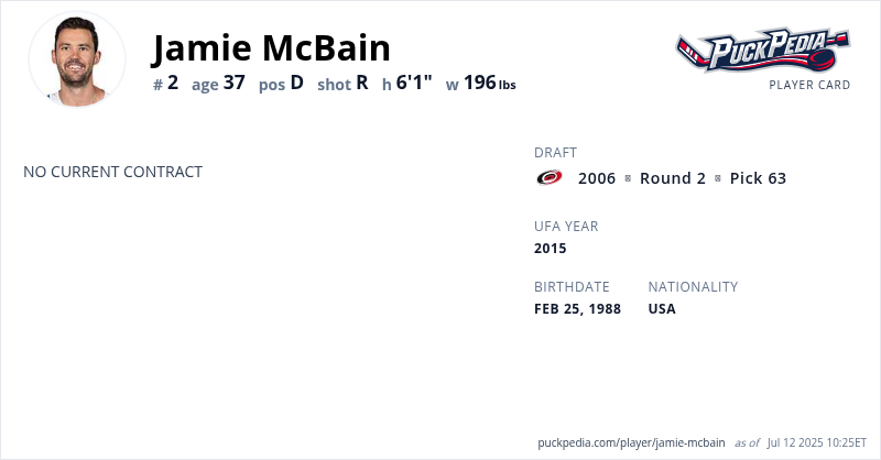 Jamie McBain is an Unrestricted Free Agent. His last contract was 1 year, $650,000 with a cap hit of $650,000 per season. It expired at the end of the 2017-18 season.