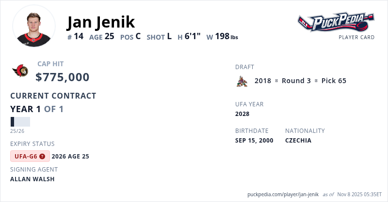 Jan Jenik is signed to a 1 year, $775,000 contract with a cap hit of $775,000 per season, playing for the Ottawa Senators. His contract expires at the end of the 2025-26 season, making Jenik an Unrestricted Free Agent (Group 6).