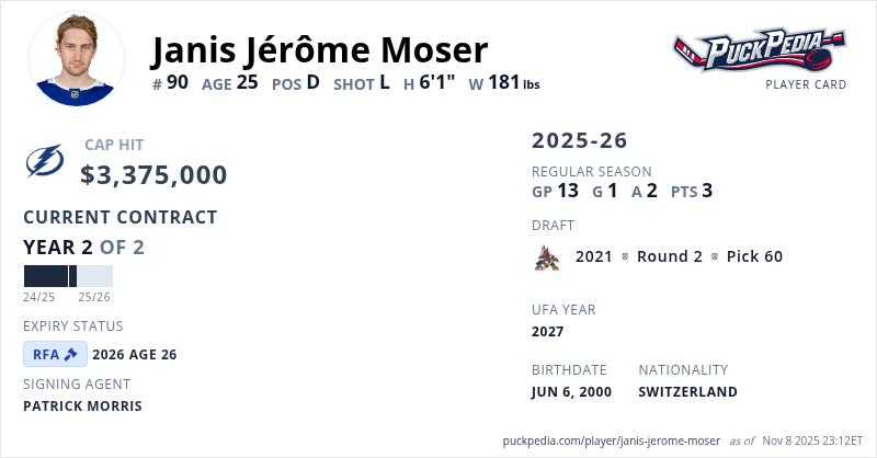 Janis Jérôme Moser is signed to a 2 year, $6,750,000 contract with a cap hit of $3,375,000 per season, playing for the Tampa Bay Lightning. His contract expires at the end of the 2025-26 season, making Moser a Restricted Free Agent.