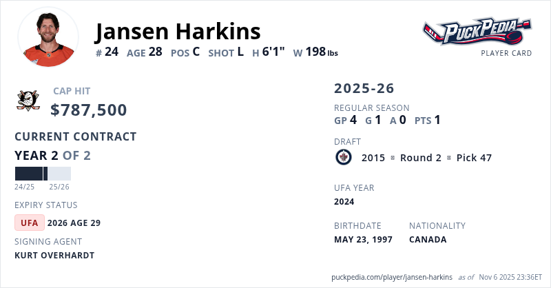 Jansen Harkins is signed to a 2 year, $1,575,000 contract with a cap hit of $787,500 per season, playing for the Anaheim Ducks. His contract expires at the end of the 2025-26 season, making Harkins an Unrestricted Free Agent.