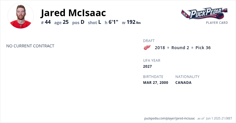 Jared McIsaac is an Unrestricted Free Agent (No Qualifying Offer). His last contract was 1 year, $787,500 with a cap hit of $787,500 per season. It expired at the end of the 2023-24 season.