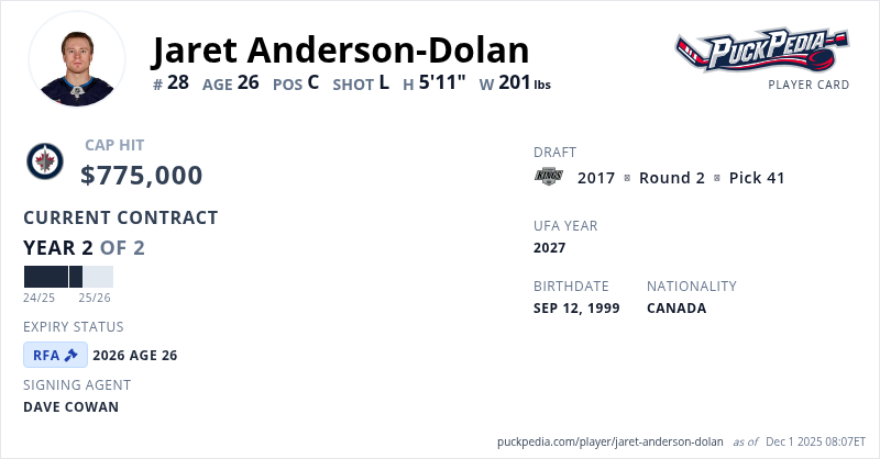 Jaret Anderson-Dolan is signed to a 2 year, $1,550,000 contract with a cap hit of $775,000 per season, playing for the Winnipeg Jets. His contract expires at the end of the 2025-26 season, making Anderson-Dolan a Restricted Free Agent.