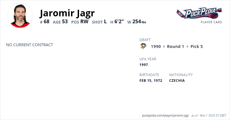 Jaromir Jagr is an Unrestricted Free Agent. His last contract was 1 year, $2,000,000 with a cap hit of $2,000,000 per season. It expired at the end of the 2017-18 season.