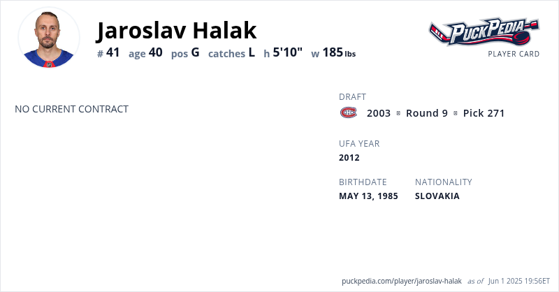 Jaroslav Halak is an Unrestricted Free Agent. His last contract was 1 year, $1,500,000 with a cap hit of $1,500,000 per season. It expired at the end of the 2022-23 season.