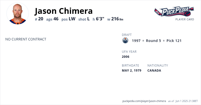 Jason Chimera is an Unrestricted Free Agent. His last contract was 2 years, $4,500,000 with a cap hit of $2,250,000 per season. It expired at the end of the 2017-18 season.