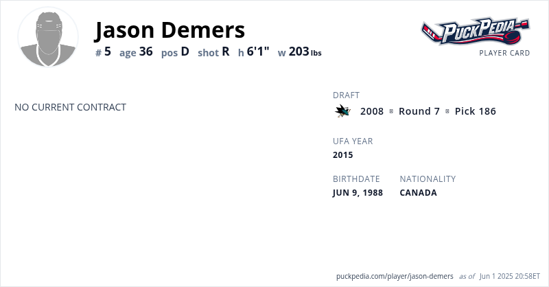 Jason Demers is an Unrestricted Free Agent. His last contract was 1 year, $750,000 with a cap hit of $750,000 per season. It expired at the end of the 2022-23 season.