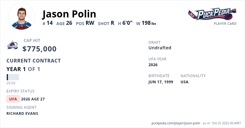 Jason Polin is signed to a 1 year, $775,000 contract with a cap hit of $775,000 per season, playing for the Colorado Avalanche. His contract expires at the end of the 2025-26 season, making Polin an Unrestricted Free Agent.