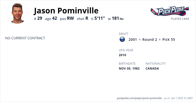 Jason Pominville is an Unrestricted Free Agent. His last contract was 5 years, $28,000,000 with a cap hit of $5,600,000 per season. It expired at the end of the 2018-19 season.
