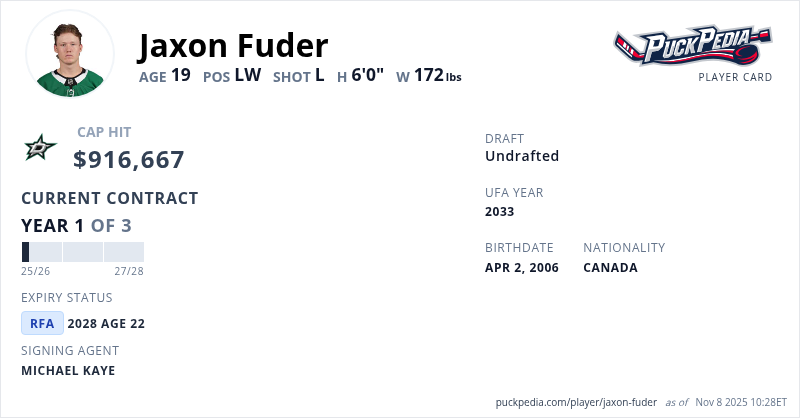 Jaxon Fuder is signed to a 3 year, $2,750,001 contract with a cap hit of $916,667 per season, playing for the Dallas Stars. His contract expires at the end of the 2027-28 season, making Fuder a Restricted Free Agent.