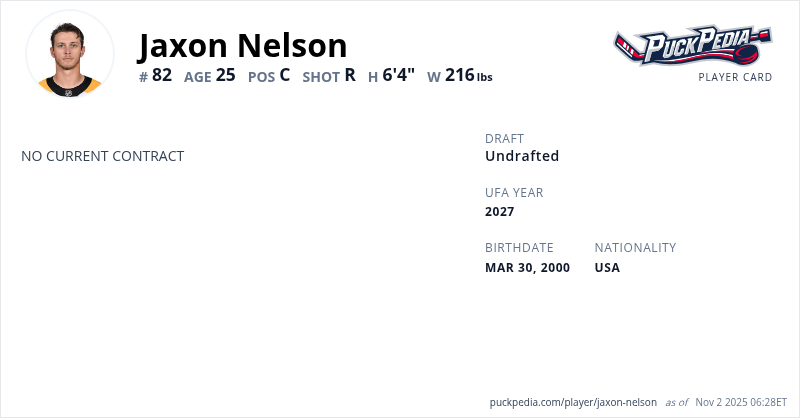 Jaxon Nelson is an Unrestricted Free Agent (No Qualifying Offer). His last contract was 1 year, $870,000 with a cap hit of $870,000 per season. It expired at the end of the 2024-25 season.