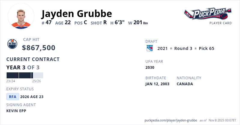 Jayden Grubbe is signed to a 3 year, $2,602,500 contract with a cap hit of $867,500 per season, playing for the Edmonton Oilers. His contract expires at the end of the 2025-26 season, making Grubbe a Restricted Free Agent.