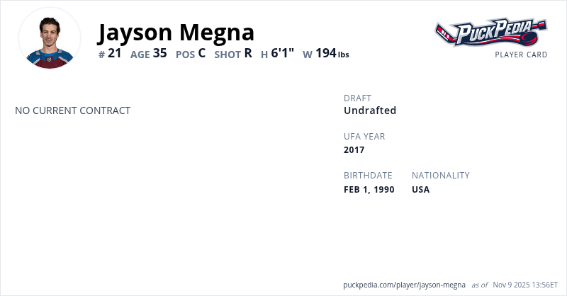 Jayson Megna is an Unrestricted Free Agent. His last contract was 1 year, $775,000 with a cap hit of $775,000 per season. It expired at the end of the 2023-24 season.