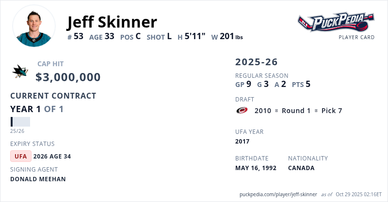 Jeff Skinner is signed to a 1 year, $3,000,000 contract with a cap hit of $3,000,000 per season, playing for the San Jose Sharks. His contract expires at the end of the 2025-26 season, making Skinner an Unrestricted Free Agent.