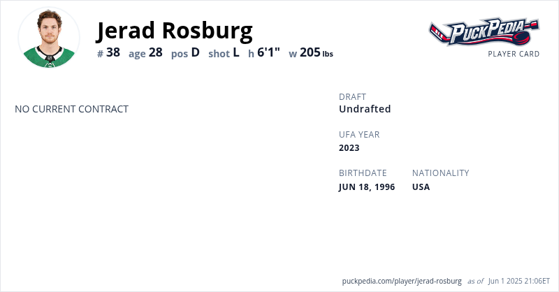 Jerad Rosburg is an Unrestricted Free Agent. His last contract was 1 year, $775,000 with a cap hit of $775,000 per season. It expired at the end of the 2023-24 season.