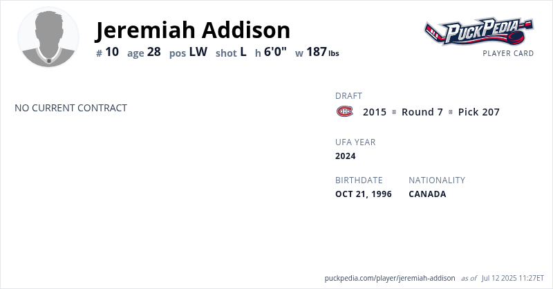 Jeremiah Addison is a Restricted Free Agent. His last contract was 3 years, $2,160,000 with a cap hit of $720,000 per season. It expired at the end of the 2019-20 season.