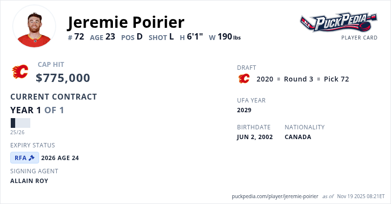 Jeremie Poirier is signed to a 1 year, $775,000 contract with a cap hit of $775,000 per season, playing for the Calgary Flames. His contract expires at the end of the 2025-26 season, making Poirier a Restricted Free Agent.