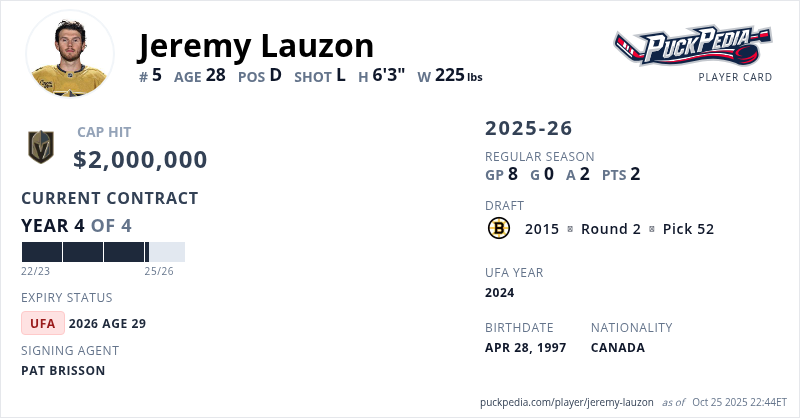 Jeremy Lauzon is signed to a 4 year, $8,000,000 contract with a cap hit of $2,000,000 per season, playing for the Vegas Golden Knights. His contract expires at the end of the 2025-26 season, making Lauzon an Unrestricted Free Agent.