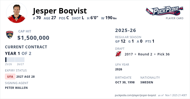 Jesper Boqvist is signed to a 2 year, $3,000,000 contract with a cap hit of $1,500,000 per season, playing for the Florida Panthers. His contract expires at the end of the 2026-27 season, making Boqvist an Unrestricted Free Agent.