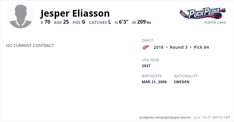 | 2017-18 | 17 | International-Jr | Sweden U18 (all) | 4 | 3 | 0.893 | 0 | |||||||||||||||||||||||
