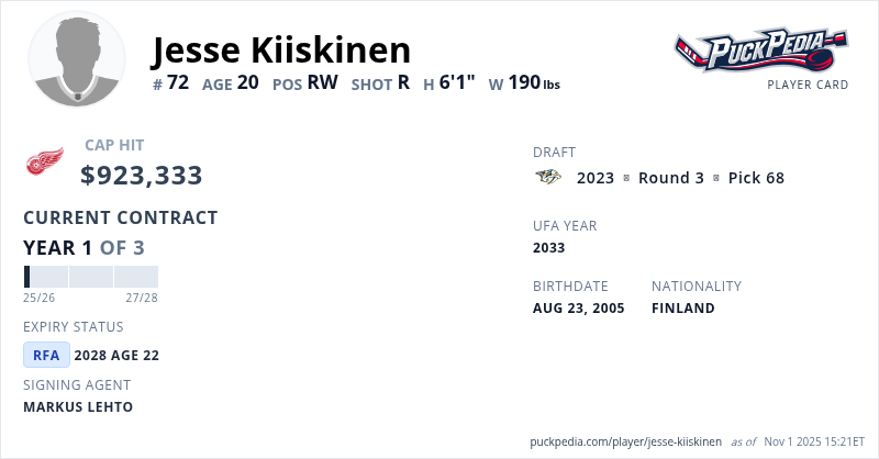 Jesse Kiiskinen is signed to a 3 year, $2,769,999 contract with a cap hit of $923,333 per season, playing for the Detroit Red Wings. His contract expires at the end of the 2027-28 season, making Kiiskinen a Restricted Free Agent.