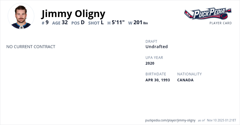 Jimmy Oligny is an Unrestricted Free Agent (No Qualifying Offer). His last contract was 1 year, $650,000 with a cap hit of $650,000 per season. It expired at the end of the 2018-19 season.