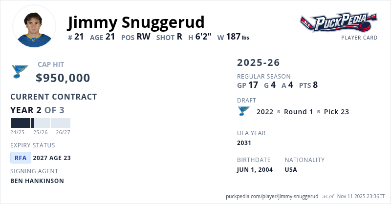 Jimmy Snuggerud is signed to a 3 year, $2,850,000 contract with a cap hit of $950,000 per season, playing for the St. Louis Blues. His contract expires at the end of the 2026-27 season, making Snuggerud a Restricted Free Agent.