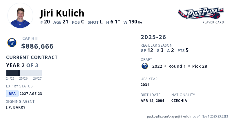 Jiri Kulich is signed to a 3 year, $2,659,998 contract with a cap hit of $886,666 per season, playing for the Buffalo Sabres. His contract expires at the end of the 2026-27 season, making Kulich a Restricted Free Agent.