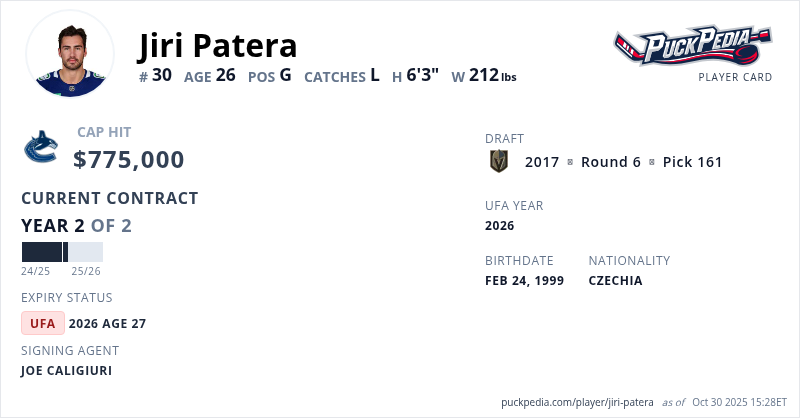 Jiri Patera is signed to a 2 year, $1,550,000 contract with a cap hit of $775,000 per season, playing for the Vancouver Canucks. His contract expires at the end of the 2025-26 season, making Patera an Unrestricted Free Agent.