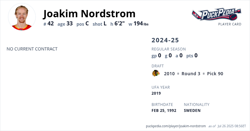 Joakim Nordstrom is an Unrestricted Free Agent. His last contract was 1 year, $700,000 with a cap hit of $700,000 per season. It expired at the end of the 2020-21 season.