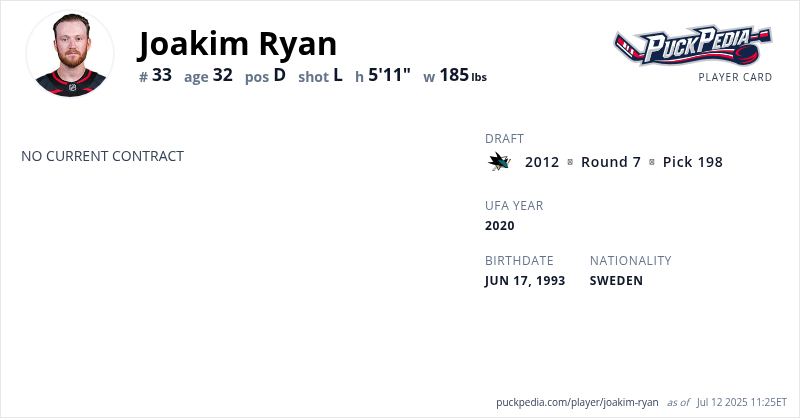 Joakim Ryan is an Unrestricted Free Agent. His last contract was 1 year, $775,000 with a cap hit of $775,000 per season. It expired at the end of the 2024-25 season.