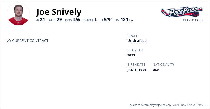 Joe Snively is an Unrestricted Free Agent. His last contract was 1 year, $775,000 with a cap hit of $775,000 per season. It expired at the end of the 2024-25 season.
