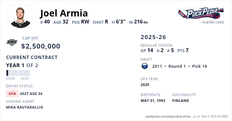 Joel Armia is signed to a 2 year, $5,000,000 contract with a cap hit of $2,500,000 per season, playing for the Los Angeles Kings. His contract expires at the end of the 2026-27 season, making Armia an Unrestricted Free Agent.