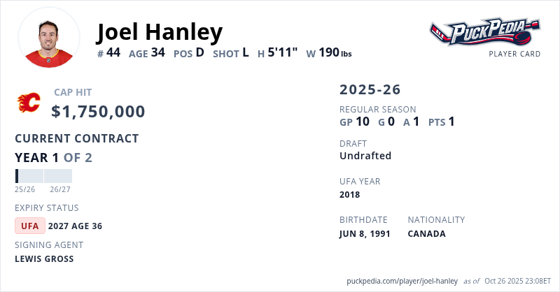 Joel Hanley is signed to a 2 year, $3,500,000 contract with a cap hit of $1,750,000 per season, playing for the Calgary Flames. His contract expires at the end of the 2026-27 season, making Hanley an Unrestricted Free Agent.