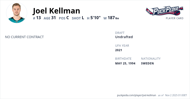 Joel Kellman is a Restricted Free Agent. His last contract was 2 years, $1,500,000 with a cap hit of $750,000 per season. It expired at the end of the 2021-22 season.