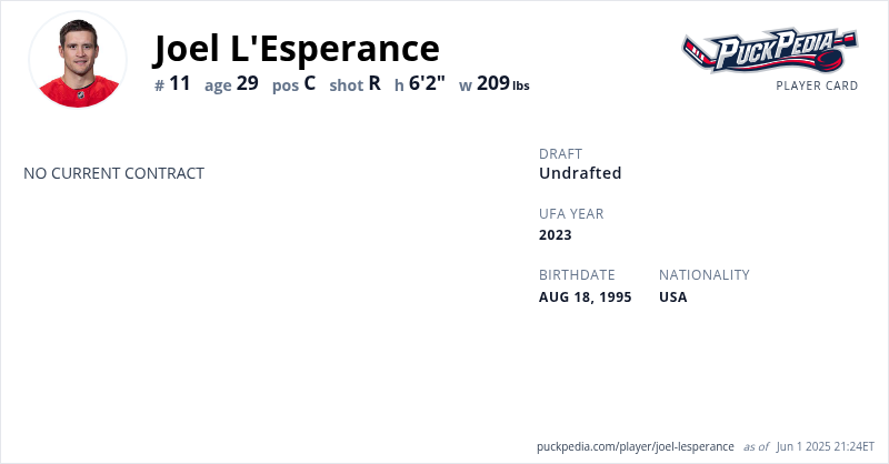 Joel L'Esperance is an Unrestricted Free Agent. His last contract was 2 years, $1,450,000 with a cap hit of $725,000 per season. It expired at the end of the 2021-22 season.