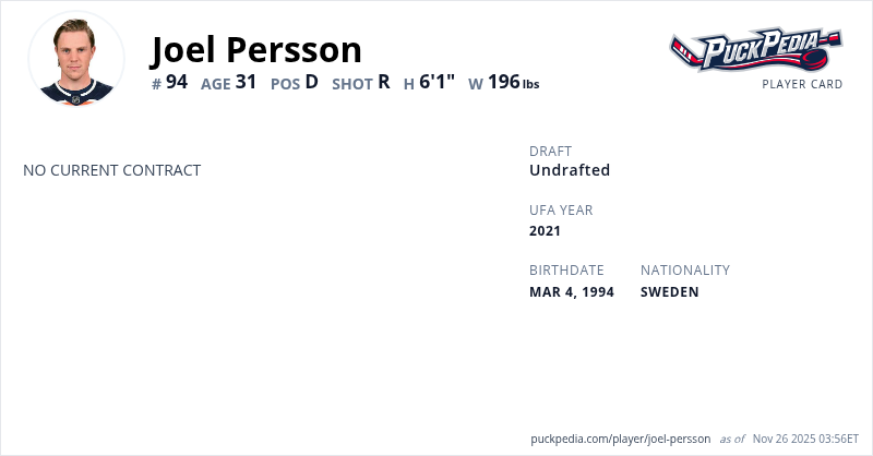 Joel Persson is an Unrestricted Free Agent (No Qualifying Offer). His last contract was 1 year, $1,000,000 with a cap hit of $1,000,000 per season. It expired at the end of the 2019-20 season.