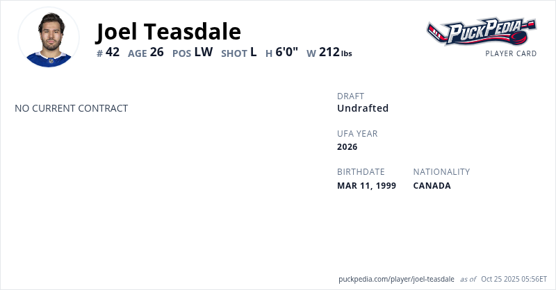 Joel Teasdale is an Unrestricted Free Agent (No Qualifying Offer). His last contract was 1 year, $750,000 with a cap hit of $750,000 per season. It expired at the end of the 2022-23 season.